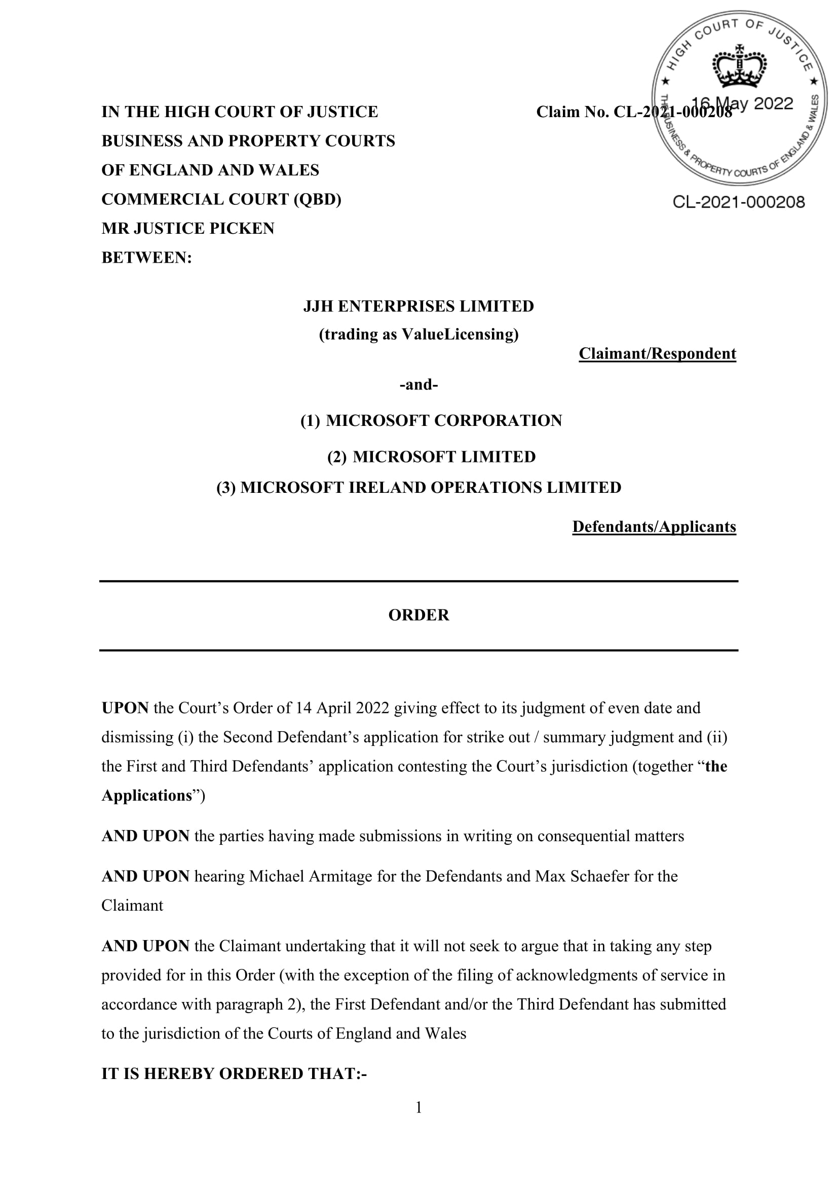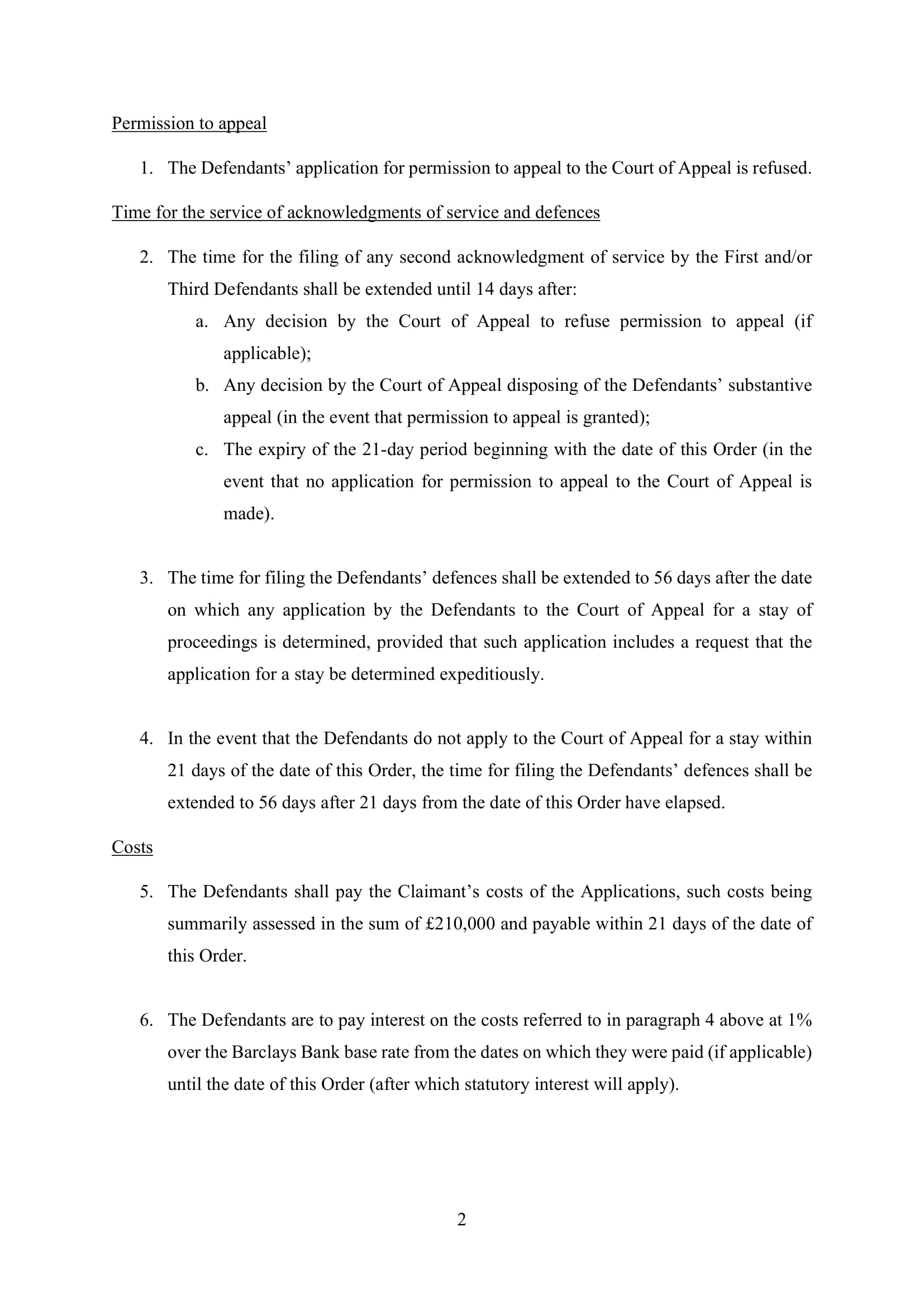 Order in relation to consequential matters which covers costs, refusal of permission to appeal, and when the defense will be due.