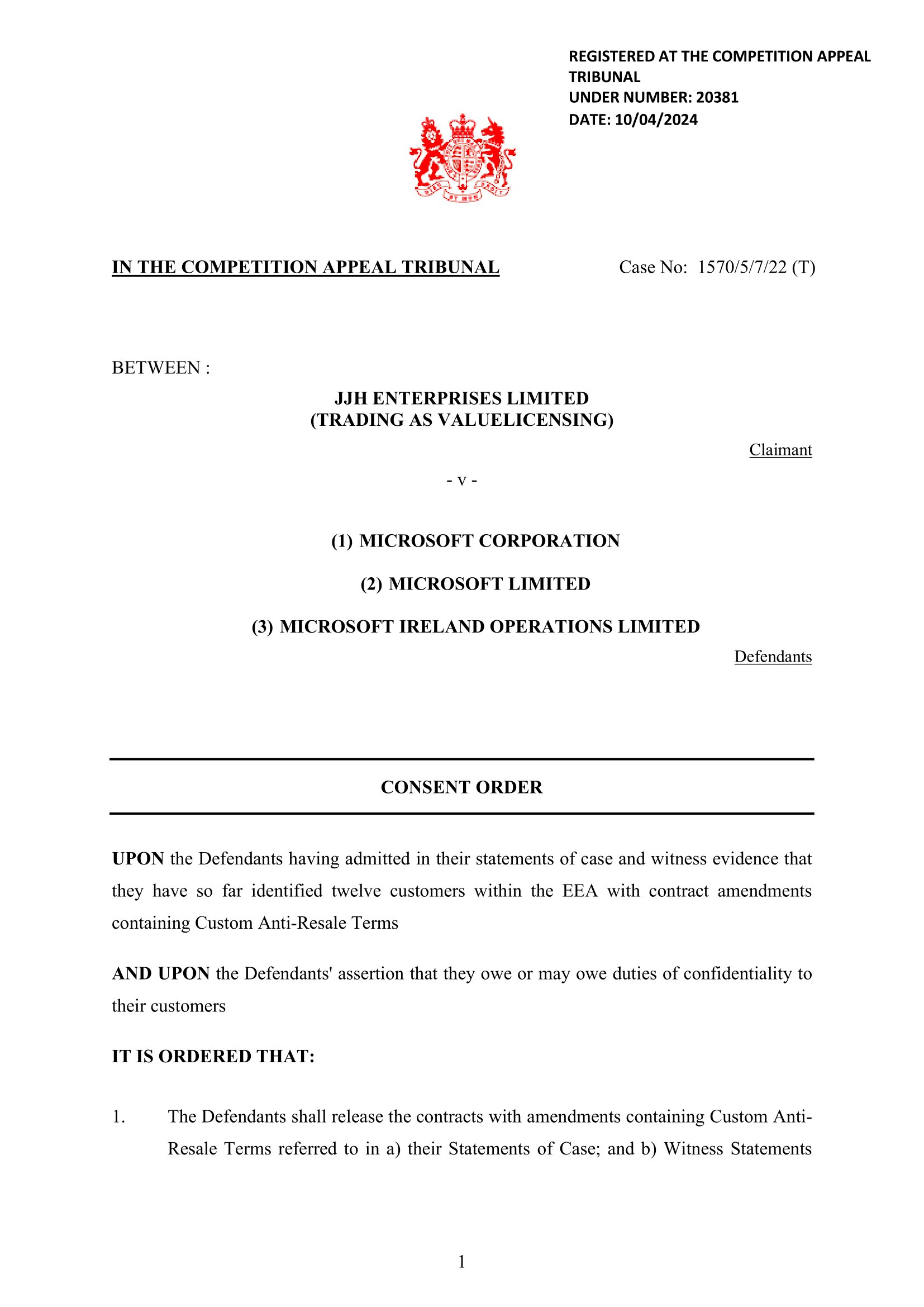 CAT - Consent Order for CAR Terms - Case No: 1570/5/7/22 (T)