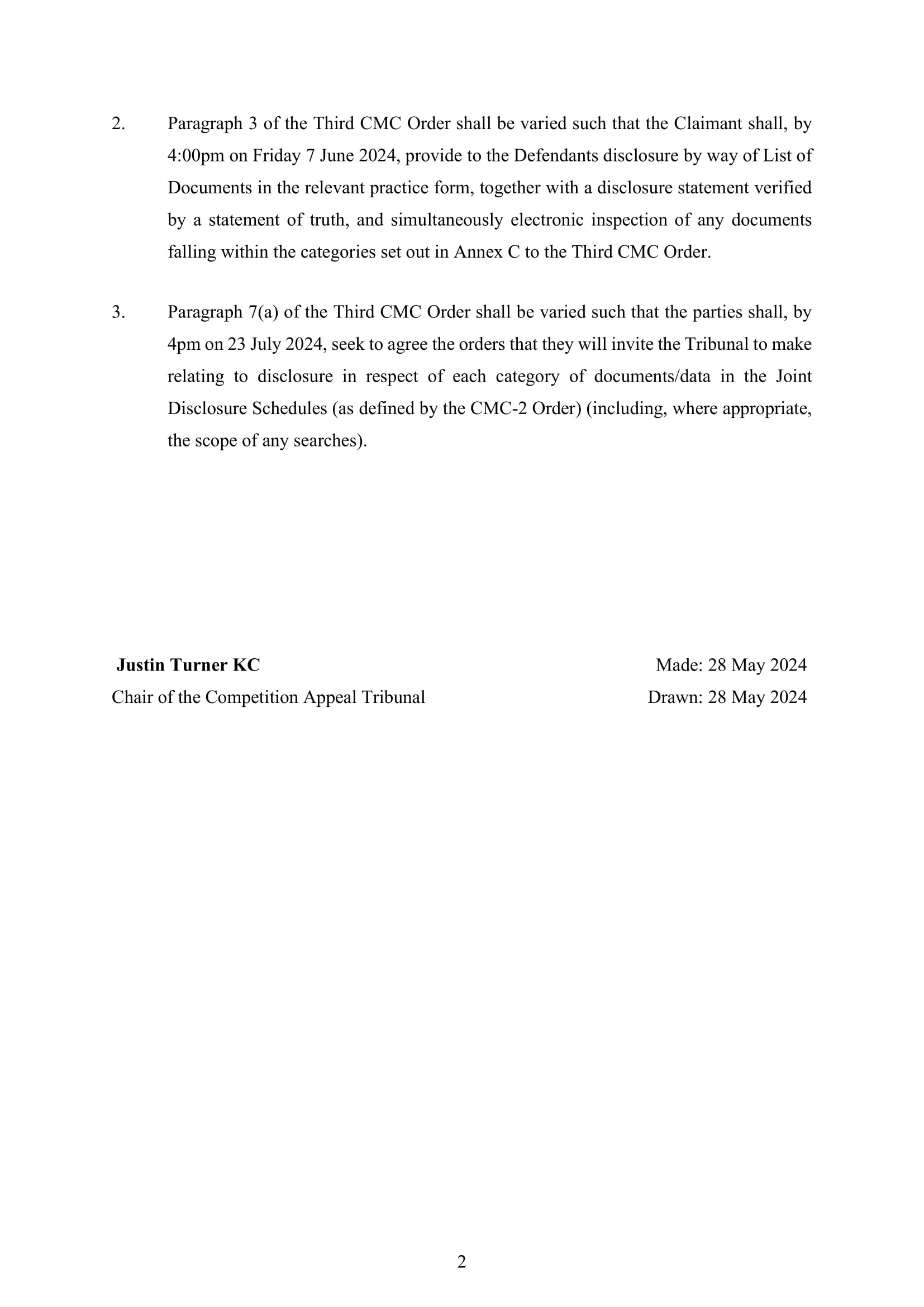 The third CMC Order shall be varied as such that the disclosure date shall be extended to 7th June 2024, and the date for the parties to have sought to agree on disclosure orders based on the Joint Disclosure Schedules from 9 July 2024 to 23 July 2024.