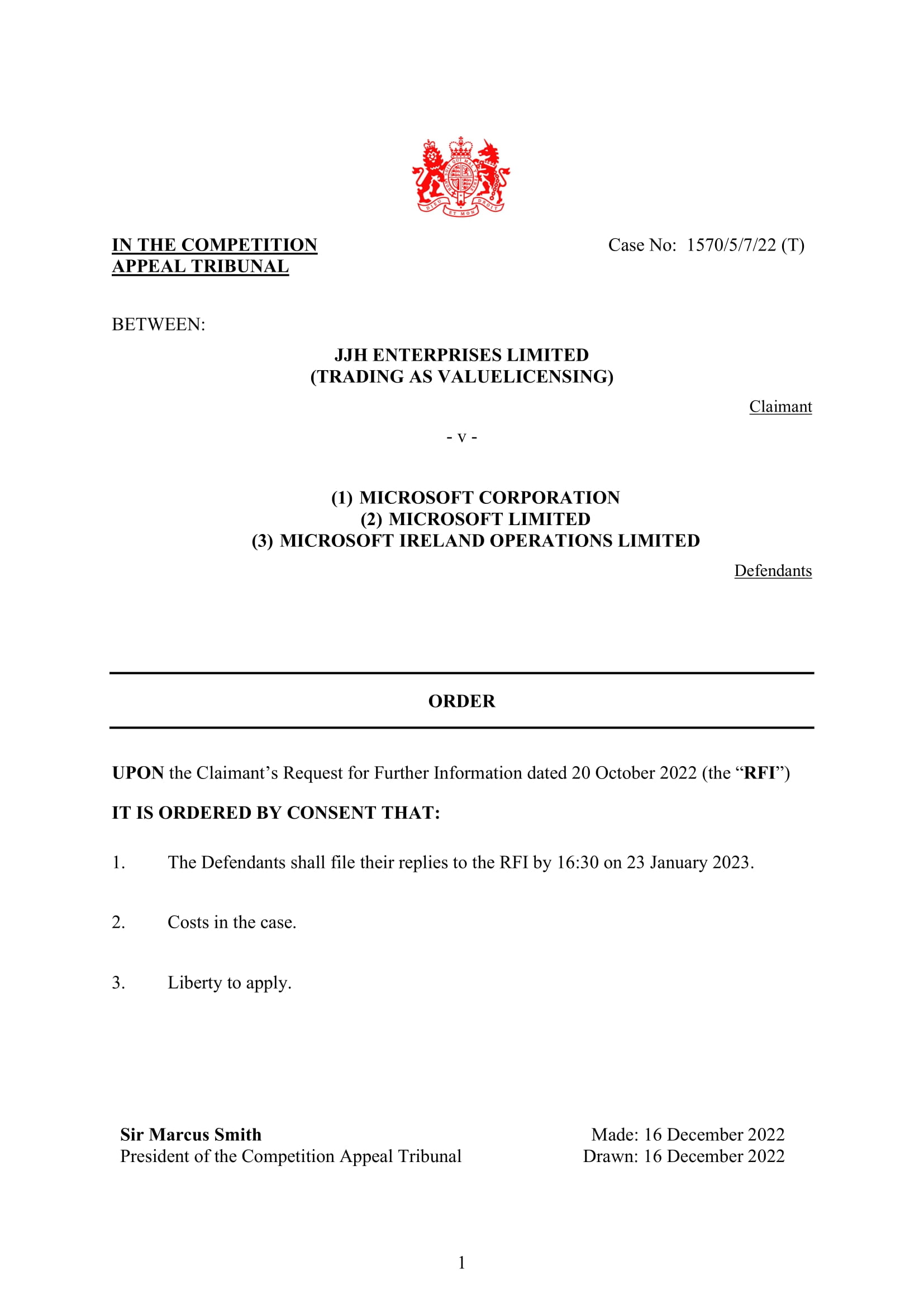 The Competition Appeal Tribunal President has made a directions order by consent for Microsoft to respond to ValueLicensing’s 20 October Request for Further Information by 23 January 2023, with liberty to apply.