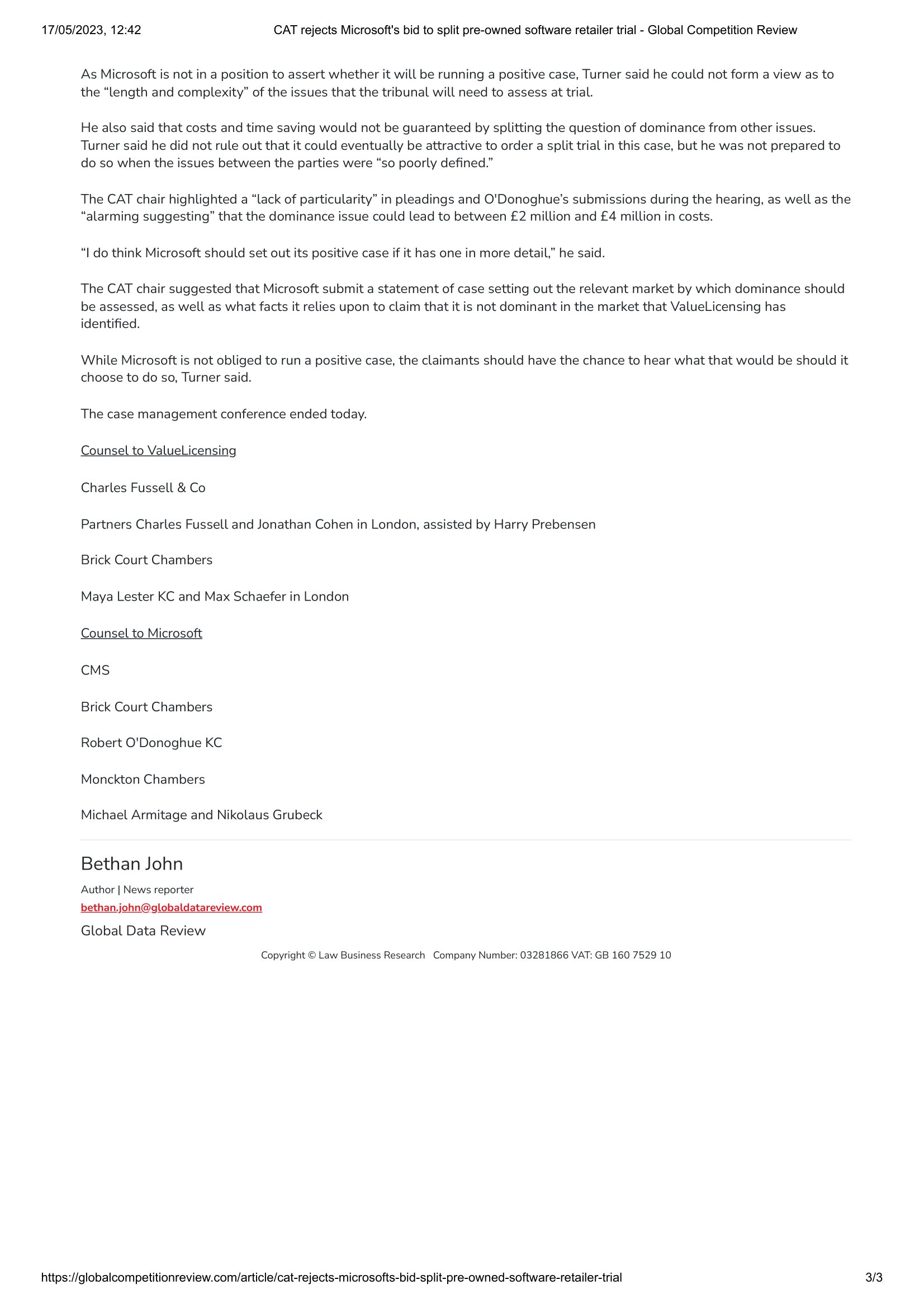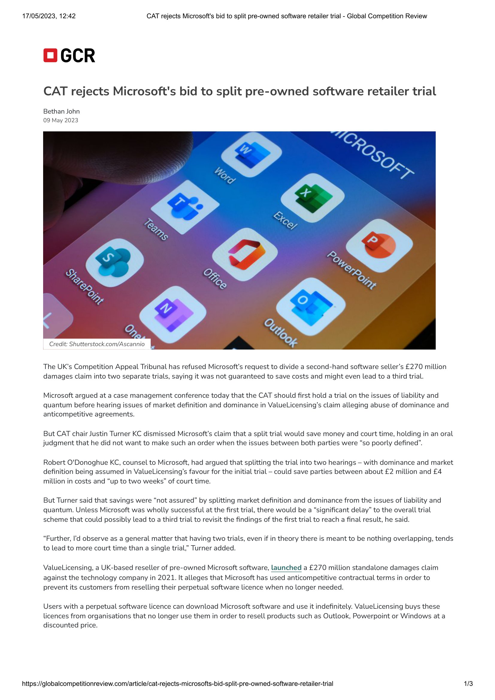 The UK’s Competition Appeal Tribunal has refused Microsoft’s request to divide a second-hand software seller’s £270 milliondamages claim into two separate trials, saying it was not guaranteed to save costs and might even lead to a third trial.
