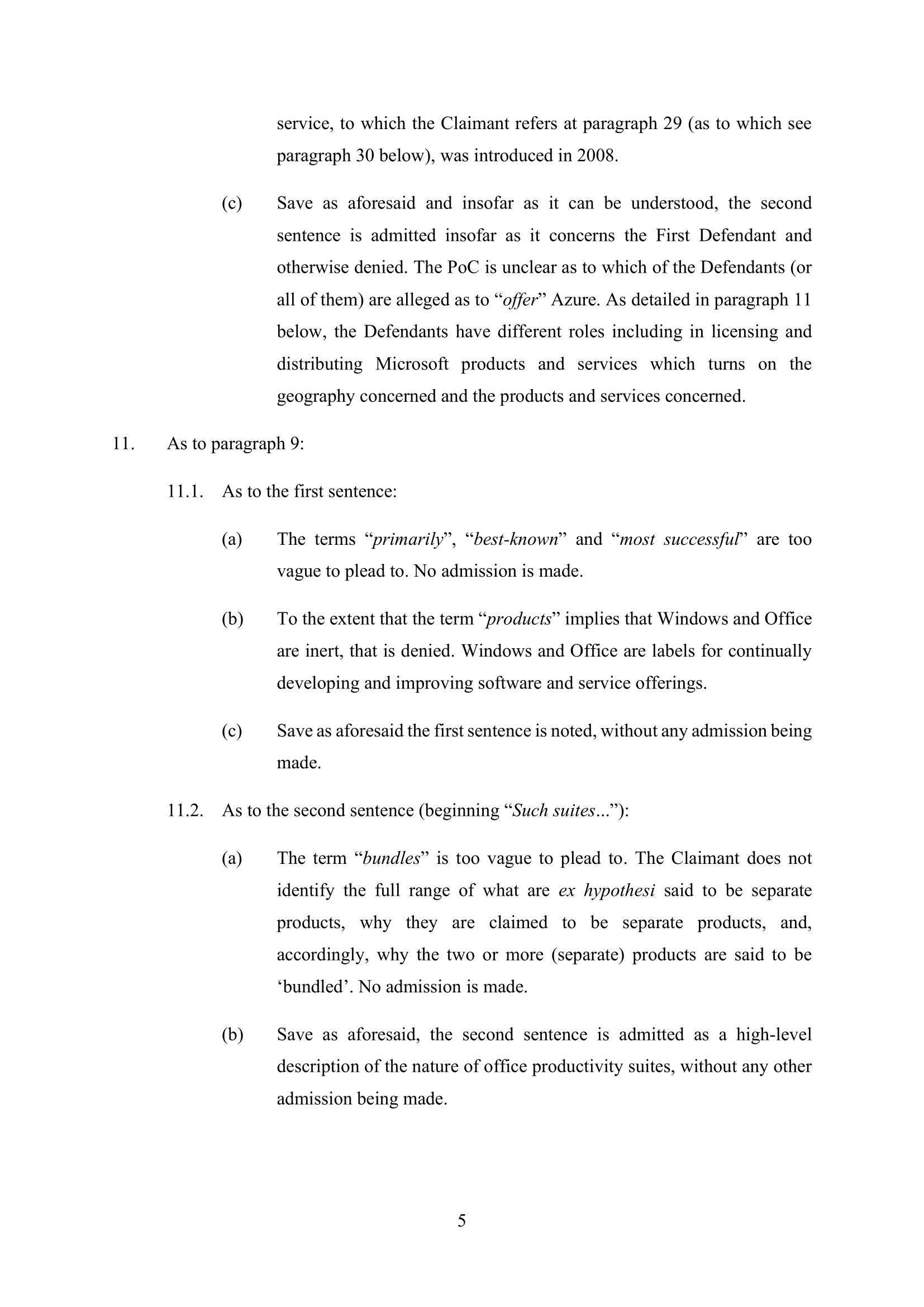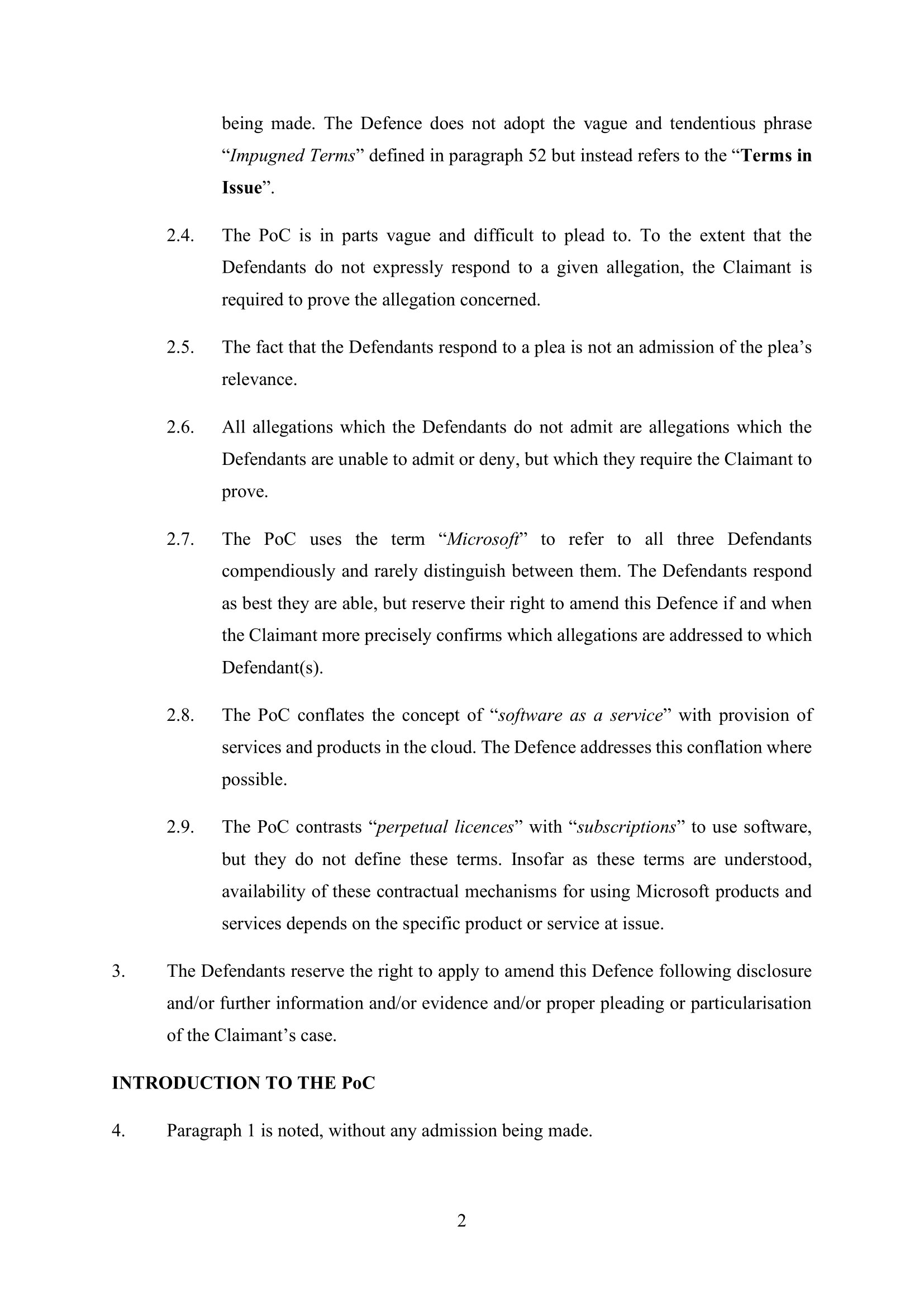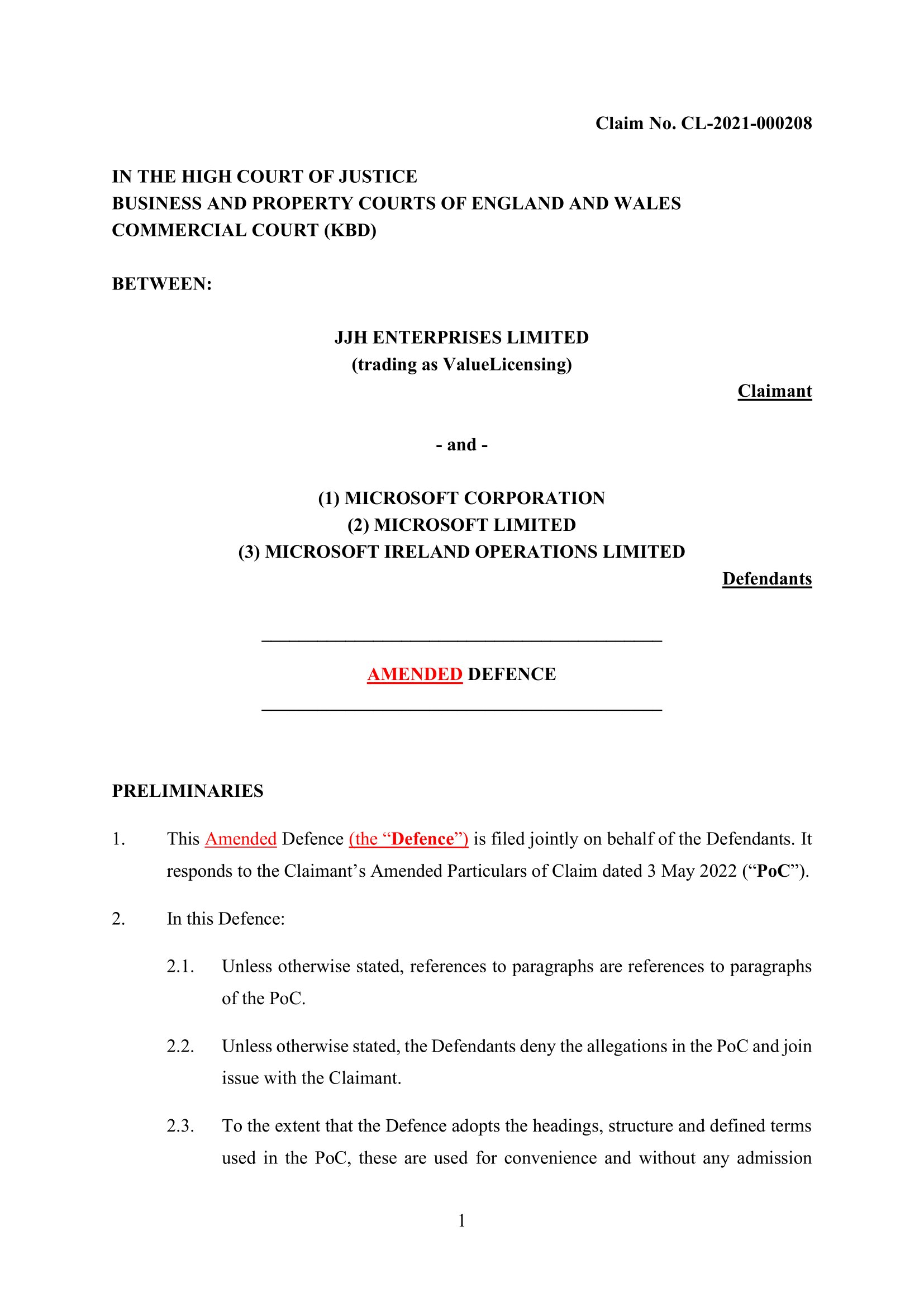 Microsoft Corporation, Microsoft Limited and Microsoft Ireland Operations Limited have amended their Defence on 5th July 2023. Claim No. CL-2021-000208